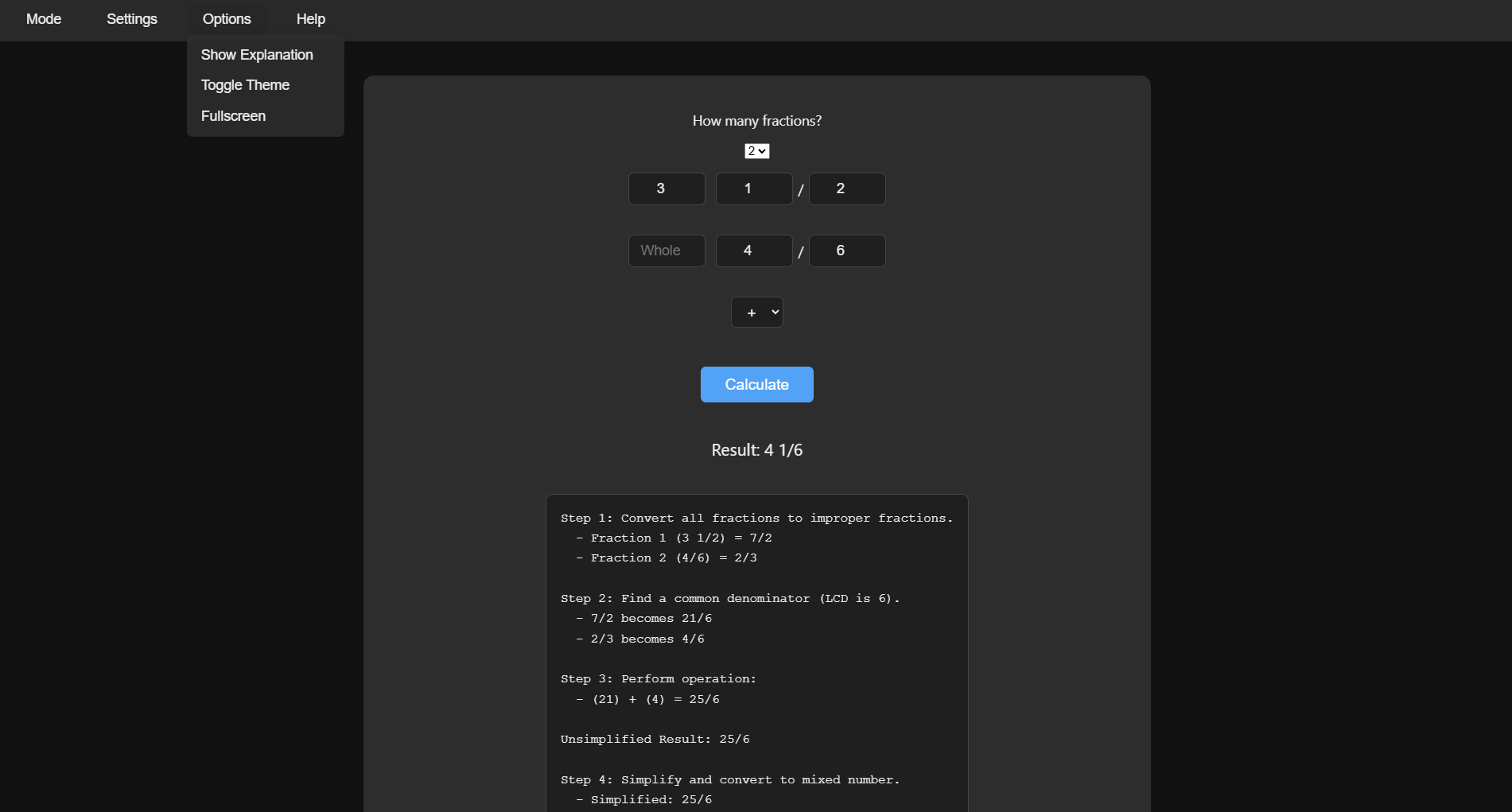 Here, you can calculate default fraction or mixed fractions. To calculate the basic, default fractions (like 1/2), just let the "whole" input empty, as it an input for mixed fractions (like 1 1/2)